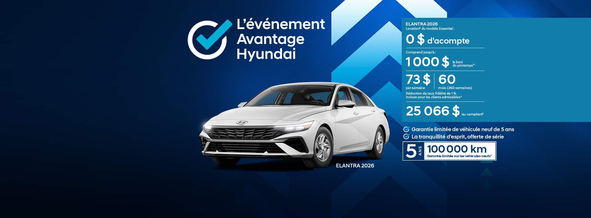 Vous trouverez également chez votre concessionnaire Hyundai à Ste-Foy près de Val-Bélair et Beauport de nombreux Hyundai d’occasion, dont de nombreuses Elantra usagées, Accent d’occasion et Tucson d’occasion, offerts à des prix exceptionnels. Venez choisir votre prochain véhicule dès aujourd’hui et profitez d’options de financement Hyundai et de promotions Hyundai imbattables. Nous vous attendons sans plus tarder!